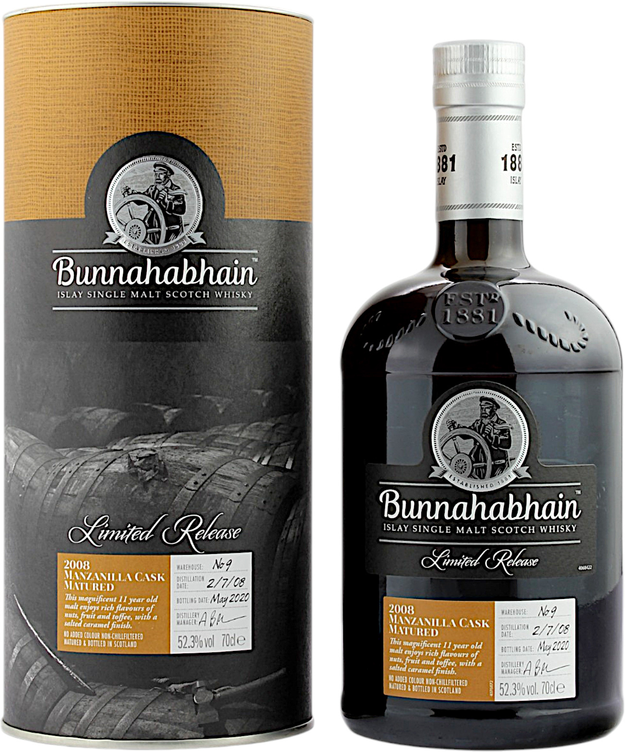 In der abgelegenen Küstendestillerie von Bunnahabhain werden seit 1881 außergewöhnliche Single Malts hergestellt. Jeder Schluck ist vom Meer geprägt, das direkt vor der Tür fließt. Auch der Manzanilla-Sherry wird am Meer produziert und hat einen ähnlichen salzigen Geschmack wie der Whisky von Bunnahabhain. Daher liegt es nahe, beides zu kombinieren. Dieser Single Malt reifte 11 Jahre in alten Manzanilla-Fässern. Während er im ruhigen Sound of Islay lagert, entwickelt er einen tiefen Charakter mit Noten von gesalzenem Karamell sowie Aromen von Eiche, Nüssen und Früchten. Abgefüllt wurde der Bunnahabhain 11 Jahre 2008/2020 Manzanilla Cask Matured mit 52.3% vol.