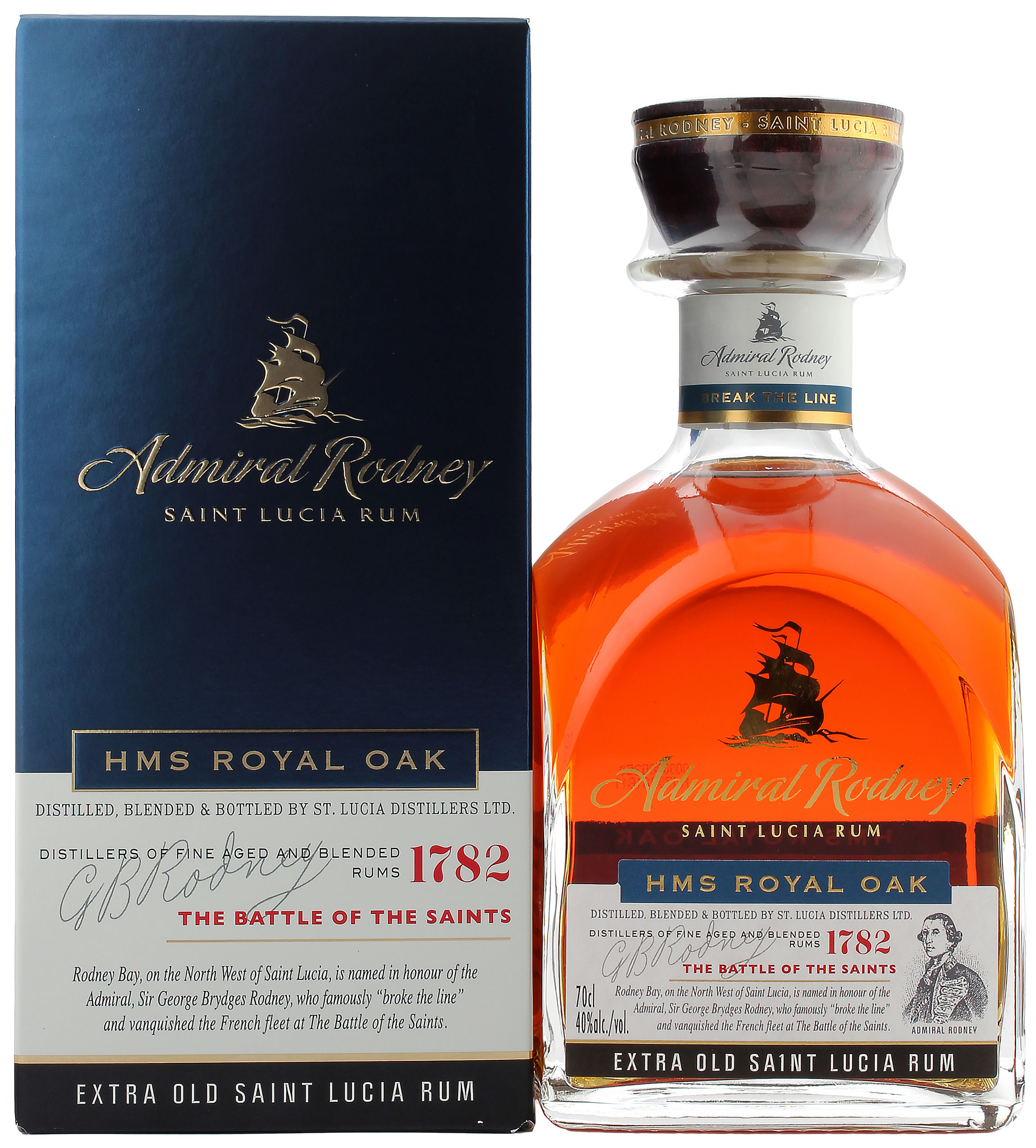 Der Admiral Rodney Rum HMS Royal ist eine Hommage an die HMS Royal Oak. Sie gehörte zu den Vorreitern der Schiffe, um die Franzosen in der berühmten Schlacht der Heiligen zu bekämpfen. Der Admiral Rodney Rum HMS Royal ist ein Blend und wird auf der kleinen Insel St. Lucia aus 7 bis 12 Jahre alten Rums, die im Coffey-Still destilliert wurden, hergestellt. Die Reifung erfolgte in Ex Bourbon-Casks. So entstand ein komplexer Rum mit süßen Aromen, Dörrpflaumen und gerösteten Eichennoten. Im Geschmack zeigt sich der Admiral Rodney Rum HMS Royal Oak harmonisch süß, mit Noten von Schokolade, Vanille und Anklängen von Tabak. Abgefüllt wird der Admiral Rodney Rum HMS Royal Oak mit 40.0% vol.