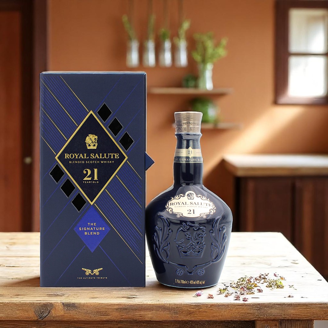 Im Aroma finden sich zarte blumige Anklänge und milde Honigsüße, tropische Früchte, gepaart mit Birne und Apfel. Der Geschmack ist samtweich und zugleich intensiv, ein Spektakel aus fruchtigen Noten und Gewürzen, mit etwas Eiche im Hintergrund und Nuancen von Nuss. Das Finish ist vollmundig lang anhaltend dank der exzellenten Balance. Die Komposition aus Malt und Grain Scotch-Whiskys wird in einer handgravierten Porzellanflasche in Saphirblau, einer der Farben der königlichen Kronjuwelen geliefert. Der Chivas Regal Royal Salute 21 Jahre Whisky kommt ohne Farbstoff und mit angenehmen 40% Vol. in die Flasche.