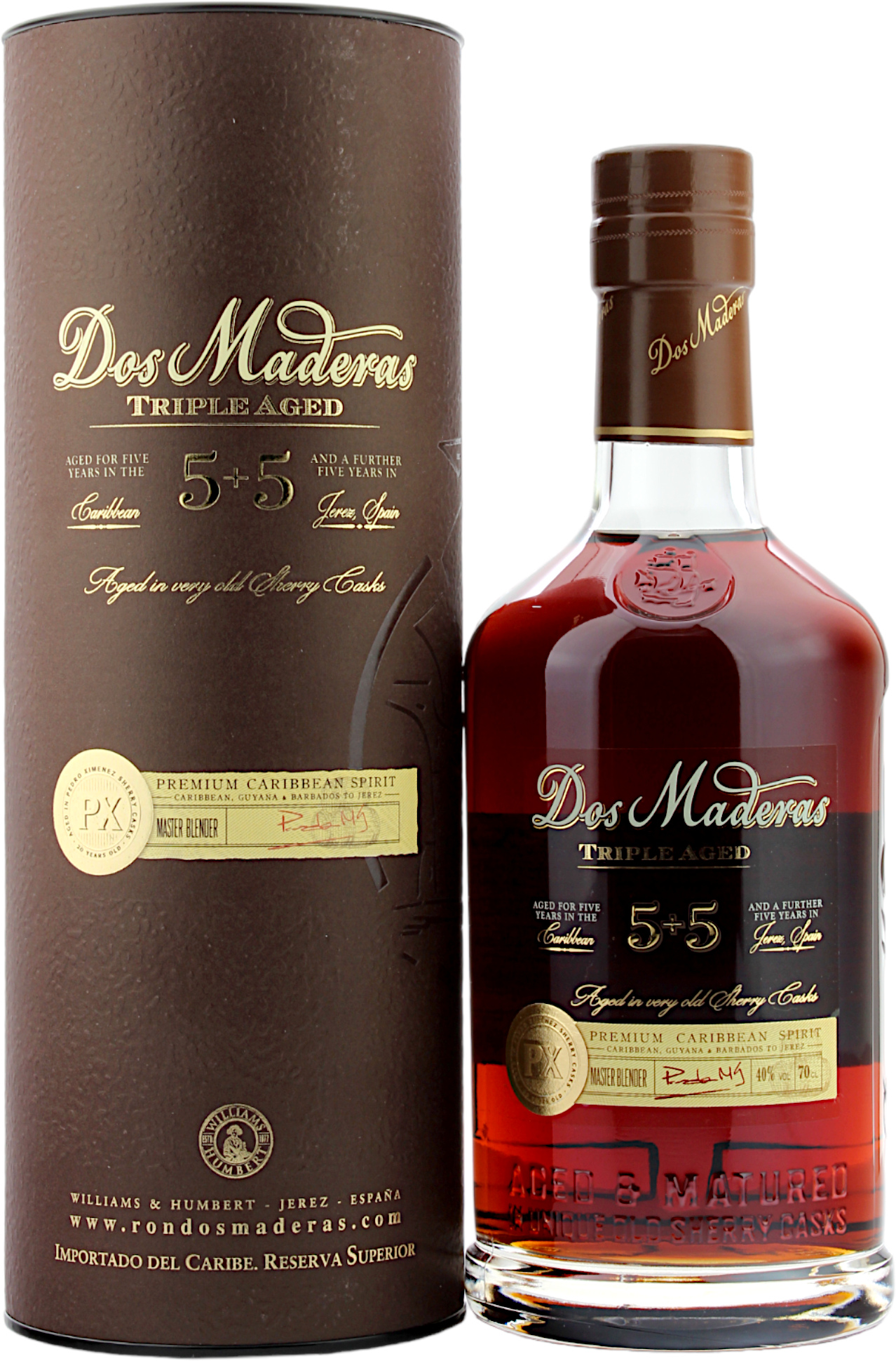 Der Dos Maderas PX 5+5 wird von Williams & Humbert aus Guyana und Barbados nach 5 Jahren Reifung importiert. In Spanien angekommen wird der Rum zunächst für 3 Jahre in Palo Cortado Sherryfässern ausgebaut und im Anschluss für 2 Jahre in ehemaligen PX Sherryfässern veredelt. So schließt sich der 5-jährigen Reifung in der Karibik eine zweite 5-jährige Reifung in Spanien an. Daher der Name Dos Maderas PX 5+5. Es entstand ein intensiver Rum mit Aromen von Feigen, Rosinen und Vanille. Im Geschmack zeigen sich fruchtige Noten von reifen Beeren und erneut Rosinen. Dazu dunkle Schokolade, Nüsse und würzig süßes Eichenholz. Der Dos Maderas PX 5+5 wird mit 40.0% vol. abgefüllt.