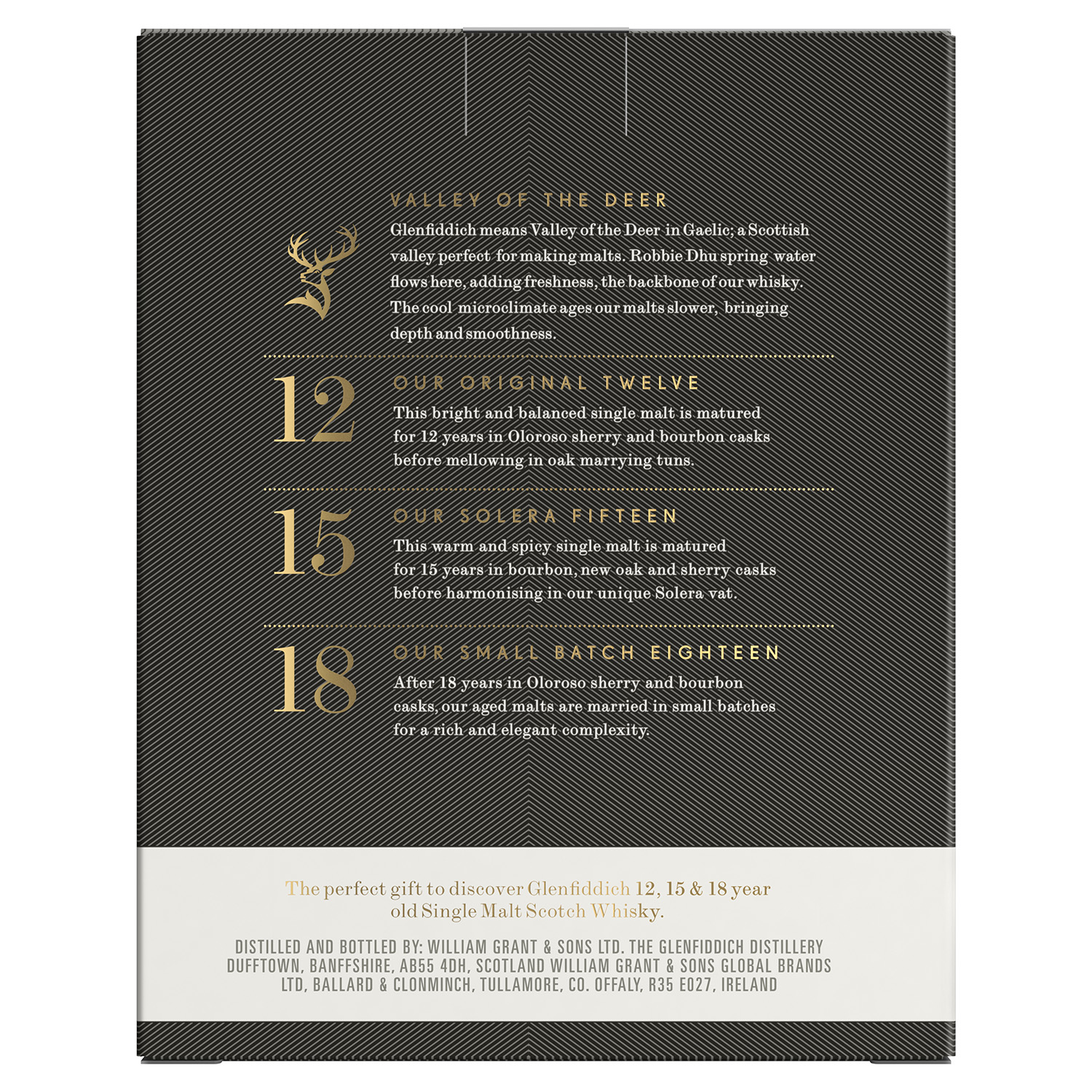 In diesem eleganten Geschenkset befindet sich je 50ml Glenfiddich 12 Jahre, Glenfiddch 15 Jahre und Glenfiddich 18 Jahre.