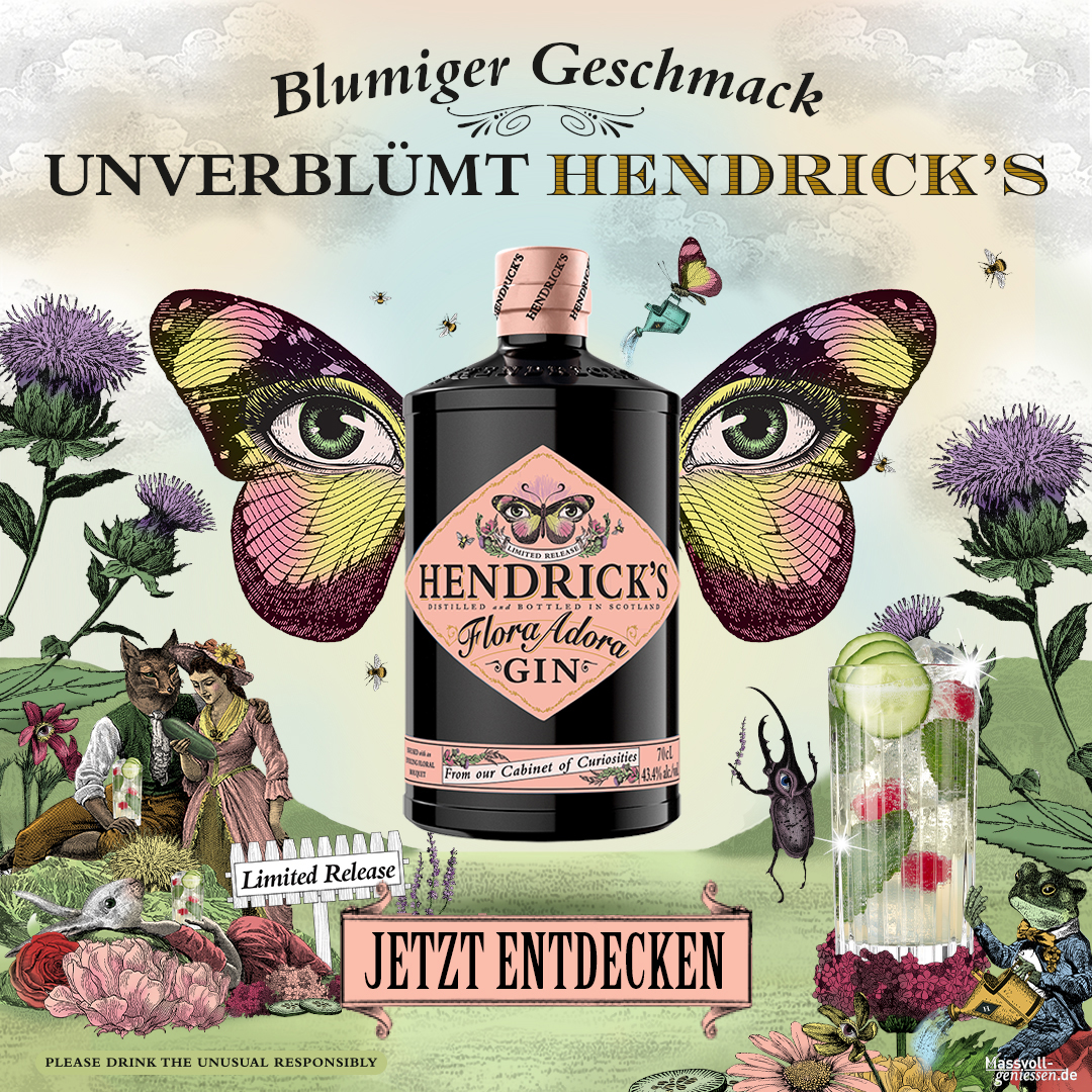 Der Hendricks Gin Flora Adora ist eine limitierte Sonderedition aus Ms. Lesley Gracie’s Kabinett der Kuriositäten. Für diesen limitierten Gin wählte Ms. Gracie eine verlockende Auswahl an Blumen, die von nektarliebenden Gartenfreunden geliebt werden, aus. So entstand ein Gin mit dominanter Frische, floralen Noten und einem fruchtigen Eindruck. Abgefüllt wird der Hendricks Gin Flora Adora Limited Release mit 43.4% vol.
