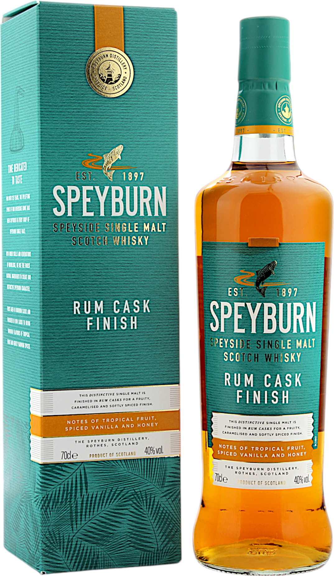 Dieser charakteristische Speyburn Single Malt Whisky Rum Cask zeichnet sich durch seine einzigartige Reifung in Rumfässern aus, die ihm ein komplexes Geschmacksprofil mit fruchtigen, karamellisierten Noten und einem dezenten, würzigen Abgang verleihen. Zunächst erfolgt die Reifung in Bourbonfässern, gefolgt von einer Nachreifung in Rumfässern, wodurch Aromen von tropischen Früchten und wohltuend wärmenden Gewürzen entfaltet werden. Diese doppelte Reifungsmethode ermöglicht eine harmonische Kombination von Geschmäckern, die die Sinne anregen und ein unvergleichliches Trinkerlebnis bieten. Abgefüllt wurde der Speyburn Single Malt Whisky Rum Cask mit 40.0% vol.