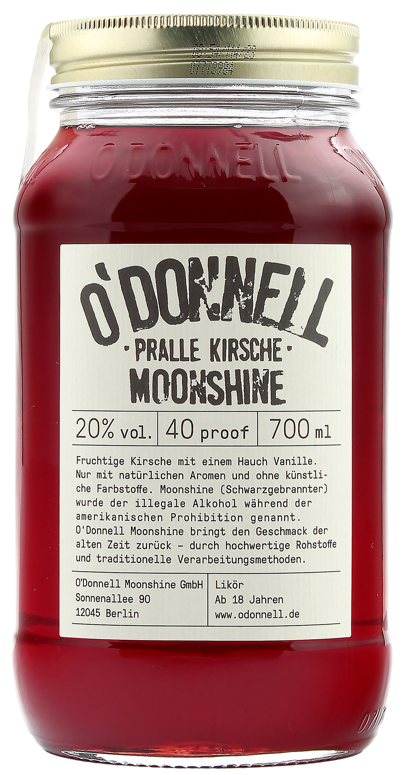Kreiert wird der Pralle Kirsche Moonshine von der O'Donnell Moonshine GmbH mit Sitz in Berlin. Durch hochwertige Rohstoffe und traditionelle Herstellungsmethoden gelang es der O'Donnell Moonshine GmbH, den Geschmack der alten Zeit zurückzugewinnen. Beim Pralle Kirsche Moonshine trifft Tradition auf neue Geschmackswelten. Im Aroma sowie im Geschmack begeistert der Moonshine mit saftigen, frischen Noten von süßen Kirschen und etwas Vanille. Abgefüllt wird der O'Donnell Moonshine Pralle Kirsche in stilechten Einmachgläsern, sogenannten Mason Jars, mit 20.0% vol.