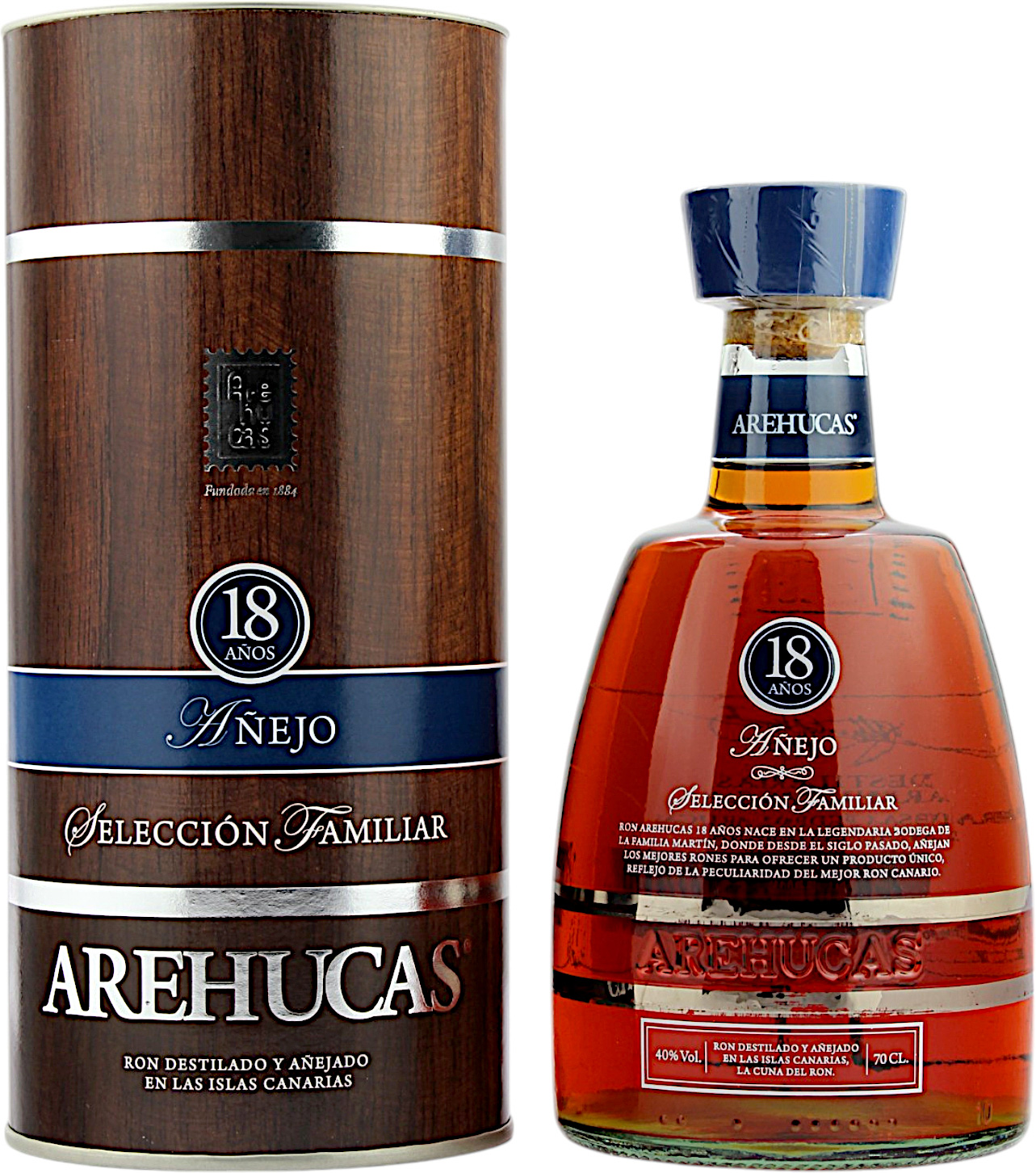 Der Ron Arehucas 18 Jahre Anejo stammt von der kanarischen Insel Gran Canaria und wird dort von der Firma Destilerias Arehucas produziert. Er rundet das Sortiment von Arehucas nach oben ab. Die kanarischen Inseln bieten die perfekten Bedingungen für den Anbau von Zuckerrohr und daher wundert es nicht, dass eine Vielzahl von sehr guten Rums von diesen Inseln kommt. Der Ron Arehucas 18 Jahre Anejo lagerte für 18 Jahre in Eichenholzfässern. Diese verleihen ihm Aromen von Trockenfrüchten, Vanille und würzig süßen Eichenholz. Im Geschmack zeigen sich Töne von Melasse, Vanille und Gewürze. Abgefüllt wird mit 40.0% vol.