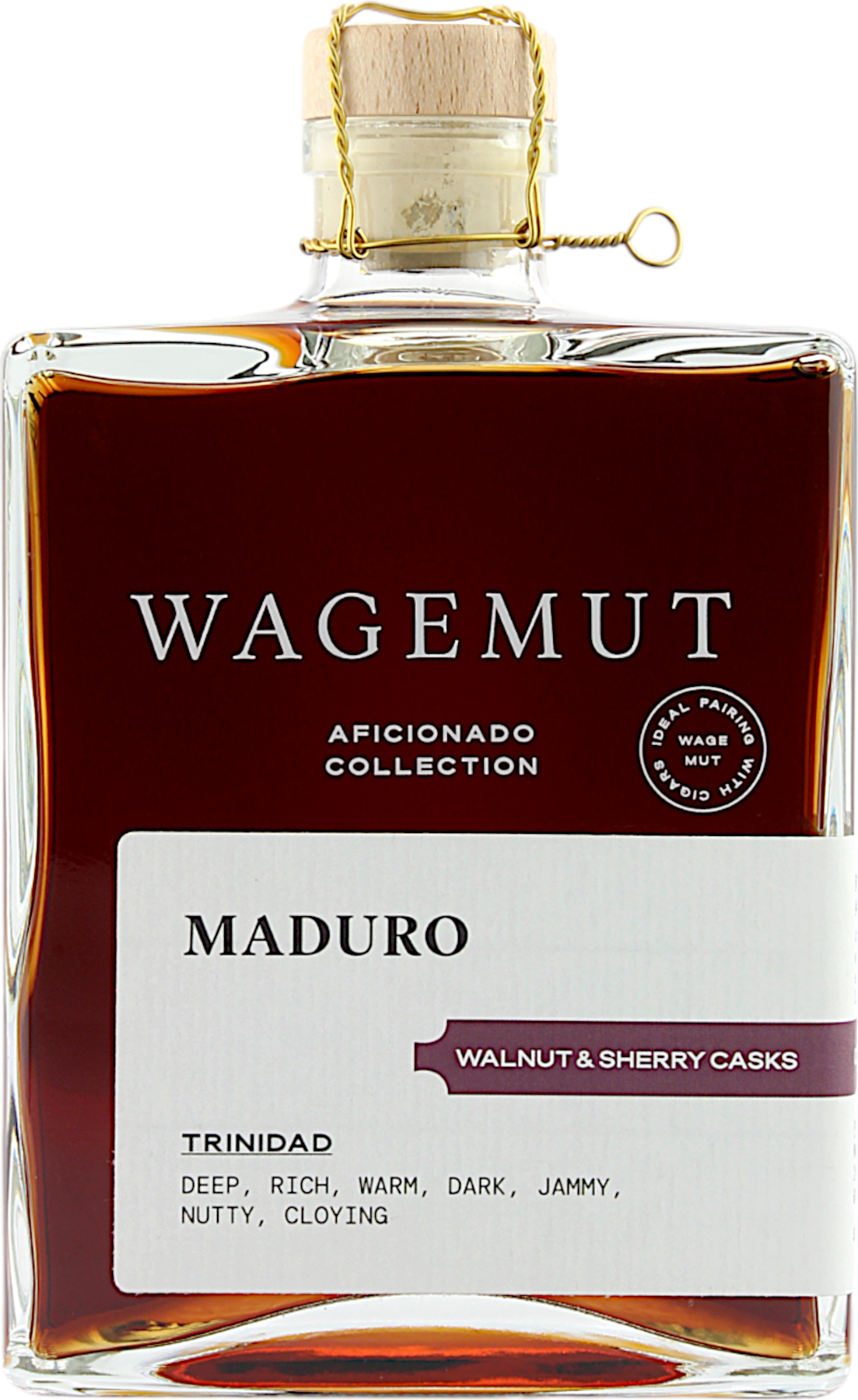 Gemeinsam mit seinem geschätzten Freund und Experten für Zigarren, Reinhard Pohorec, kreierte Nicolas Kröger dieses herausragende Werk als ideale Ergänzung zu einer Maduro-Zigarre. Inspiriert von der Wagemut Special Edition 2021 wurden für den Maduro edler Rum aus Trinidad und hochwertiger PX-Sherry vermählt und in Fässern aus Walnussholz gereift. Eine abschließende Lagerung in äußerst seltenen Palo Cortado Sherryfässern, die bereits seit 30 Jahren existieren, ermöglichte eine harmonische Verbindung der vielfältigen Aromen. Abgefüllt wurde der Wagemut Maduro (Aficionado Collection) mit 47.6% vol.